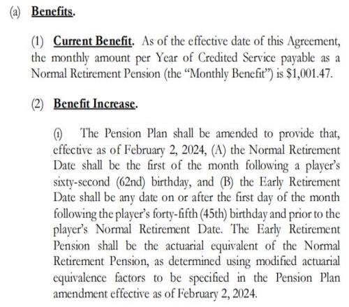 近日,在NBA中国赛期间,姚明在受访时提到,他打算与NBA球员公会(NBPA)执行董事伊戈达拉聊聊自己的养老金问题。 据直播吧消息,姚明表示:“我很兴奋能在这里见到很多朋友。例如,布鲁克林篮网队的助理教练霍华德是我在火箭队时的老队友。还有,你知道刚刚退休后在球员工会工作的伊戈达拉,我得跟他聊聊我的养老金等很多事情。” 同样来到NBA中国赛现场的伊戈达拉对此回应称:“我们始终致力于照顾好我们的成员。即使在球员结束职业生涯后,我们依然努力保持联系,协助他们完成人生的转型。” 近日,来到NBA中国赛现场的伊戈达拉回应关于姚明的退休金问题。视频截图 伊戈达拉表示:“姚明现在远在大洋彼岸,但我们能和他联系上。我们协会的核心工作是维护球员的权益,无论是商业层面还是赛场之上。我们会帮助球员适应NBA的生活,从职业运动员的各个维度为他们提供保护。” NBPA官方发布的最新版劳资协议(CBA)显示,NBA球员可以领取按月支付的退休金,最早可从45岁开始领取,但每月领取的金额会相应减少,62岁以上退休可领取全额养老金。 具体而言,当球员在62岁以上“正常退休”时,每月可领取1001.47美元×效力年限的全额退休金。此外,球员可选择在45岁生日次月的第一天及之后、正常退休日期之前的任意日期退休领取养老金,领取的金额需按照规定的精算系数递减。 NBA退休金相关规定。 NBA2023版劳资协议截图 NBA退役球员协会前总裁兼首席执行官斯科特·罗谢尔曾表示,退役球员可以选择最早在45岁开始领取养老金,但是这样的话,由于他们领养老金的时间会大大拉长,因此他们能够领到的总数额就将有所削减。“联盟鼓励球员们在62岁开始领养老金,这样他们领到的金额将大大增多。” 姚明1980年9月出生,刚满45岁,且在NBA效力了9年,因此已经满足NBA退休金的领取条件。若姚明选择从62岁开始领取全额退休金,则每月可领取9913.23美元(约人民币7万元)。 本文系观察者网独家稿件,未经授权,不得转载。 |