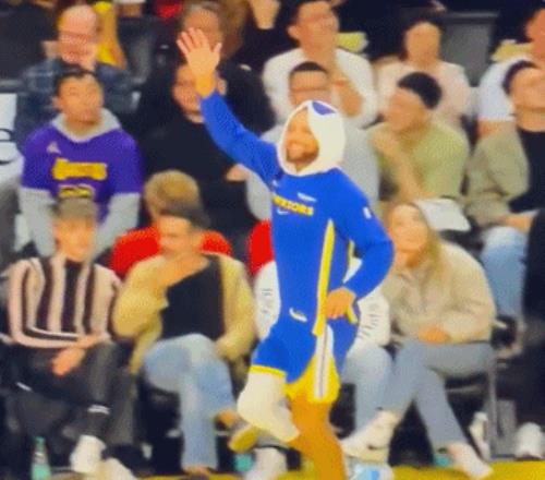 勇士一度将分差扩大到两位数,库里在场边做出了挥手拜拜的动作。